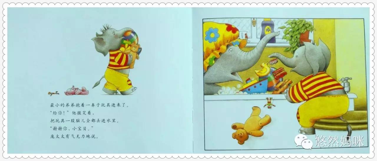 凡是养育过孩子的人,看到这本书,都会露出会心一笑的,书中的场景实在太过熟悉了,特别是家有两孩子的妈妈更是深有感受。孩子出生后,做为妈妈想安静地呆一会儿,或者安心的睡一觉都成了奢侈品,书中的大象妈妈也一样。